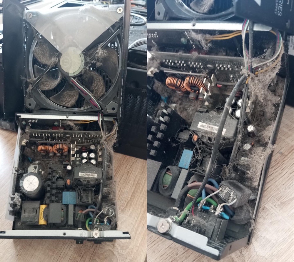 Много грязи скапливается в блоке питания. Не бойтесь его разбирать: гарантия на блок дается в лучшем случае на два-три года, и за это время он не успеет наглотаться пыли. На пятый год это может стать проблемой, а гарантия вам уже не поможет. На фотографии ниже – блок, который я не чистил со дня покупки (около 8 лет).