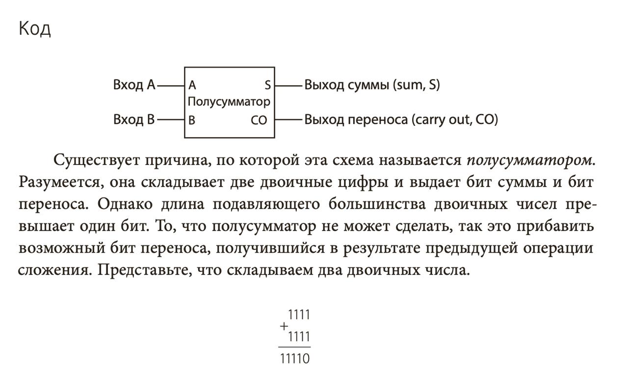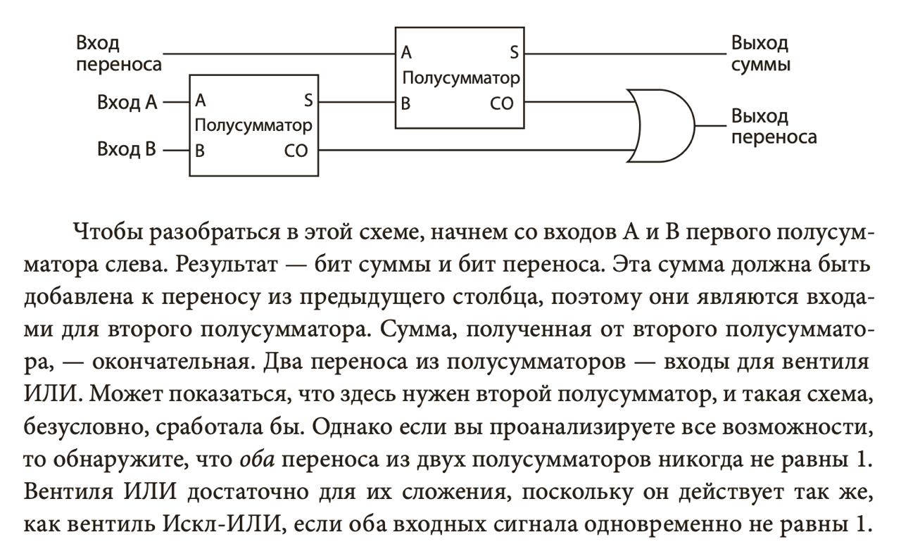 Чтобы сложить два бита, для начала проектируют полусумматор. Это логический элемент, который состоит из других элементов проще. Полусумматор принимает два бита (входы) и возвращает бит результата. Если подать нули, результат будет ноль, если 0 и 1 или наоборот, то 1.