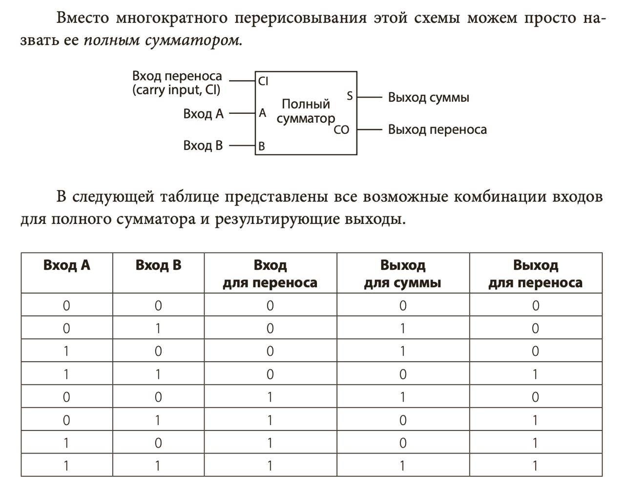 Почему “полу”? Потому что если подать 1 и 1, мы должны получить 0 (результат) и 1 (бит переноса). У полусумматора нет переноса, поэтому бит 1 пропадет. Чтобы этого не случилось, из двух полусумматоров делают полный. Он принимает не два, а три входа: два бита (входы) и перенос, который, возможно, образовался при сложении прошлого разряда.