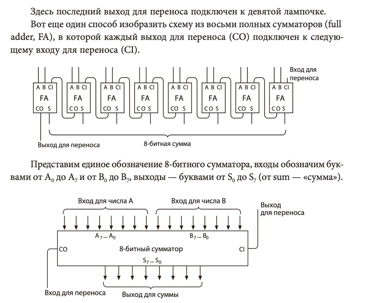 Множество сумматоров объединяют в каскад, и можно складывать многобитные числа: 4-, 8-, 16- и 32-битные. Пусть вас не смущают четырехбитные числа: такие архитектуры были в старых калькуляторах. Обратите внимание, что последний флаг переноса никуда не делся: складывая числа, мы должны быть готовы к тому, что последний разряд переполнился, и с этим нужно что-то делать.