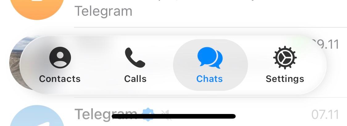 А вот другой пример. Обновил Телеграм на телефоне, и пожалуйста – дизайнер решил поиграться с жидким стеклом. Нижний бар стал пилюлей, которая висит в воздухе.