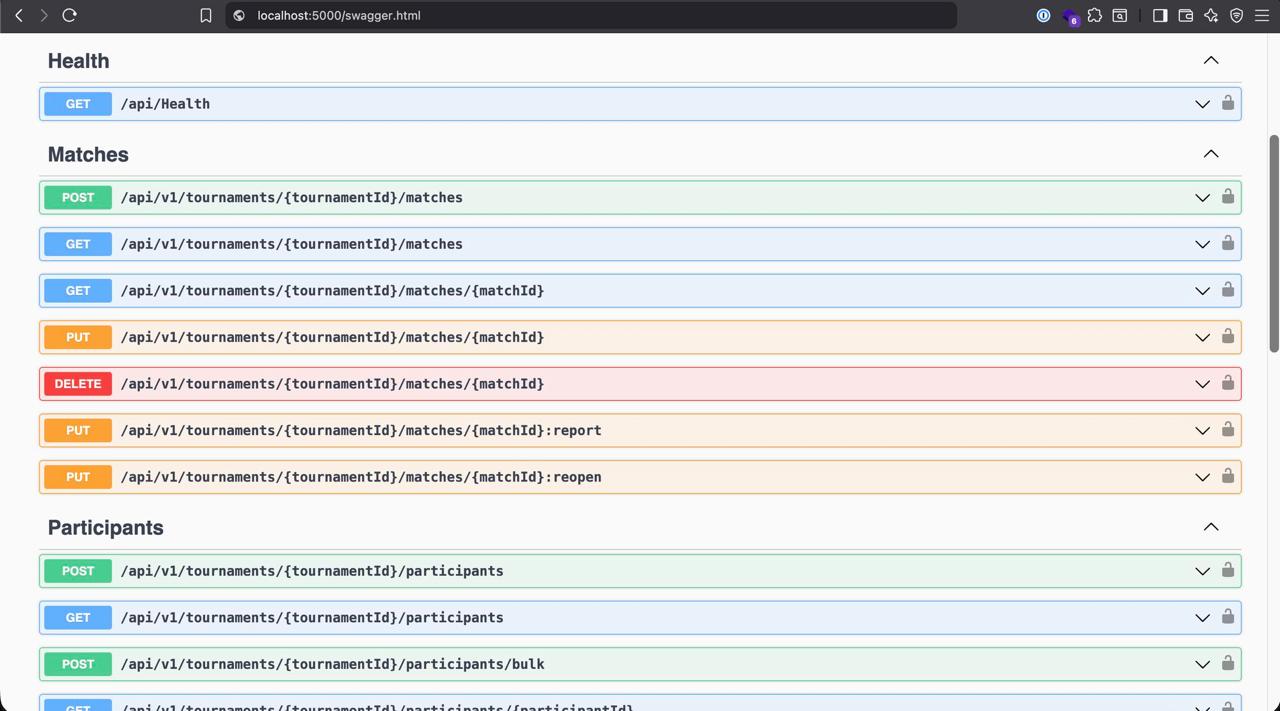 v1в урле. Она всегда меня забавляла. Я работал во многих стартапах, и ни один из них не сменил версию. Гораздо чаще стартапы закрываются и продаются. Я считаю, апишка должна быть одна, и со временем какие-то методы добавляются, какие-то снимаются с обслуживания. А в той нумерации, что на скриншоте, слишком много пафоса. Примерно как объявить счетчик с шестью нулями для значения, которое в лучшем случае достигнет двойки. Даже если предположить, что появится новая апишка, просто сделай другой урл:/api/grpcили/api/graphql.Далее, иерархия. Те апишки, которые работают с матчем, требуют код турнира. Нужно передать две айдишки: турнира и матча. Зачем? Разве может матч относиться к разным турнирам? Это банальная избыточность, и делается она ради красоты. Должен передаваться только матч, а по нему легко найти турнир и проверить права.