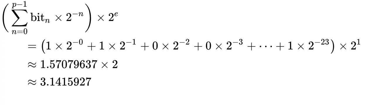 p– точность (число бит),n– номер текущего бита,e– экспонента. Картинка с формулой: